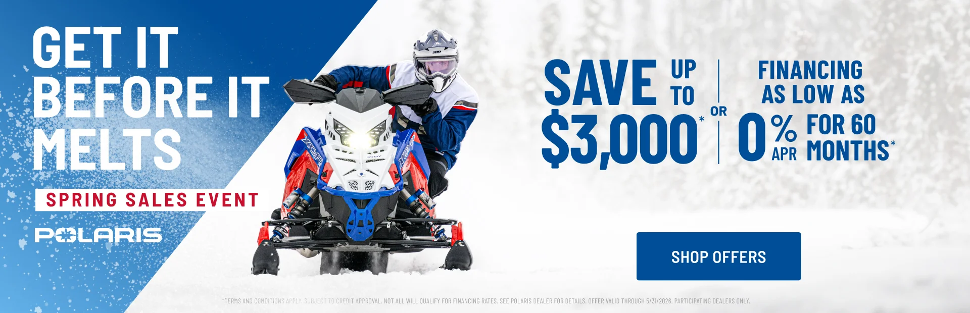 **Promotional finance offers (rates as low as 0.00 % for 60 months) valid on only select new 2024-2026 model Polaris snowmobiles purchased from participating authorized Canadian Polaris Snowmobile dealers between February 1st, 2026 – March 31st, 2026. Minimum payments required. Offer may not be combined with certain other offers, is subject to change and may be extended or terminated without further notice. Model specifications subject to change. Model & year exclusions apply. See your local dealer for details. This special finance offer is in lieu of any rebate offers.